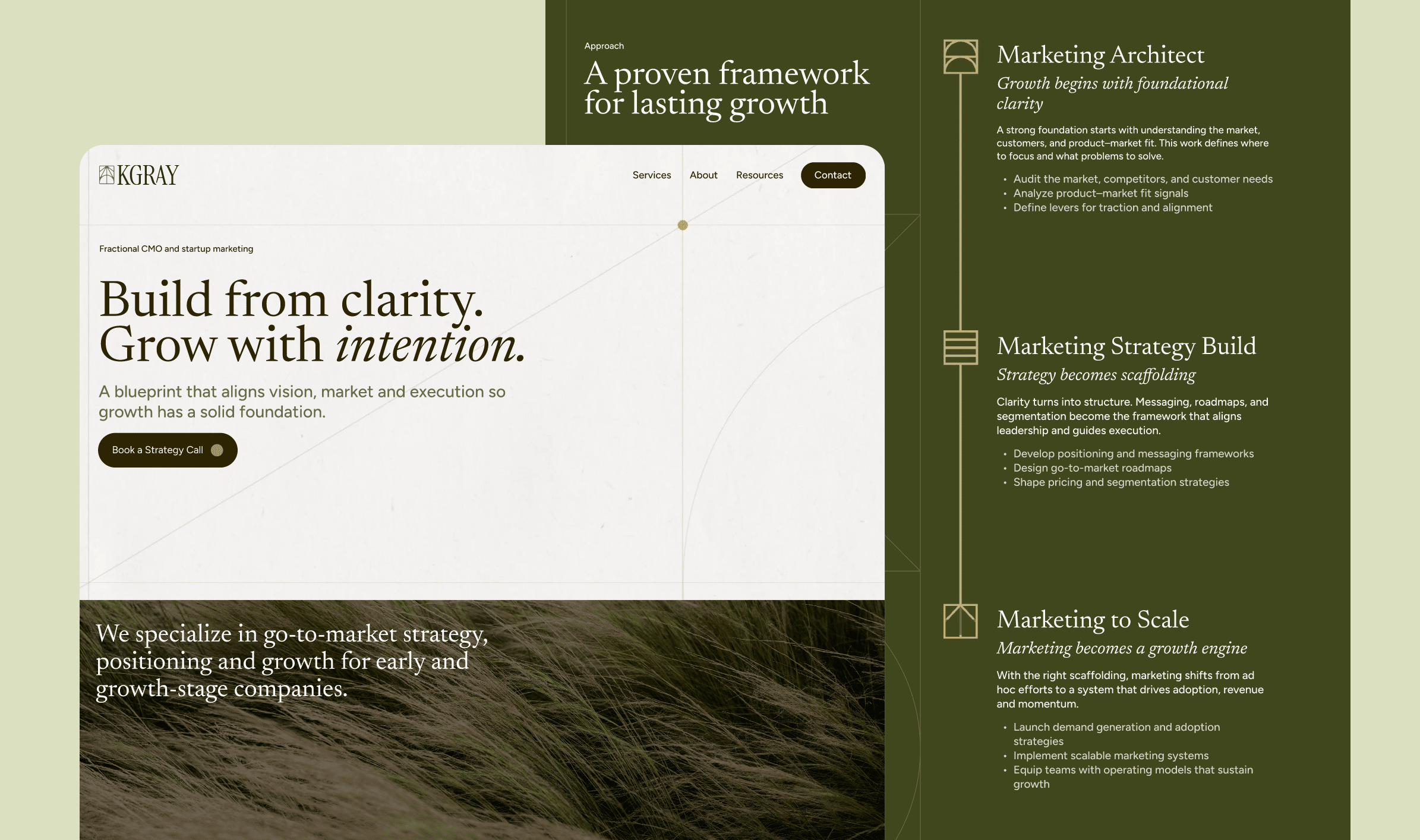 KGRAY MarketingHow KGRAY Marketing Elevated From Scrappy Startup to Premium Brand Presence Hey Reader, When we first started working with Katherine of KGRAY Marketing, she was starting from the same place most of our clients tend to be coming from. Katherine started off her marketing consultancy from a scrappy origin—DIYing her website while making a name for herself—until eventually, she’d outgrown the website (and brand) she’d built. She knew that eventually, the time would come to double down on the brand she’d built and make it feel more cohesive and visually pleasing. Because even though Katherine is technically a solopreneur, her business has served name brands like Meta and FullScript (just to name a few). After spending enough years refining her ideal client avatar, Katherine also discovered that her previous branding, messaging, and even business services were long overdue for an upgrade. Her project was never about just coming up with a new website design or stunning visuals, but supporting her as she stepped into a completely different playing field. She’d also been comparing the costs and outcomes of investing in brand versus utilizing some of the other AI tools that have come on the market. But ultimately, Katherine knew that the future of her brand deserved time, care, and attention from a design team of real, living humans, not robots. When it comes to what we focused on with Katherine’s project, we executed several brand transformations that supported her new, more premium positioning, like… Establishing a brand that stands out in the fractional marketing industry, especially because she offers marketing services to her own clients Structuring her website like a growth engine that would lead clients through their individualized customer journey, instead of feeling like a stale billboard Focusing on her craft and how it translates to her services by incorporating several sections of her website that explain her process + expertise in more detail Connecting the dots between multiple audience segments on the same page, instead of adding multiple clicks’ worth of unnecessary pages Crafting a holistic marketing strategy that encompassed SEO + blogs so the long-term gain from her website can compound over time Setting her up for the future of search with AEO (Answer Engine Optimization)—implementing JSON schema markup on each key page so that AI-powered answer engines like ChatGPT and Google AI Overviews are pulling the right information about her brand One of our favorite parts about this project was getting to play with the sheer scope and size of how Katherine’s brand is perceived. Because even though KGRAY Marketing is a business that’s technically only operated around Katherine’s services, her brand appears bigger and bolder, especially compared to her biggest competitors. Ready for your brand + business to take up more space and start turning heads? Click here to take a look at our pricing guide or send us an inquiry form right here. Now booking projects for Q3 Until next time, |